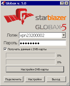 В большинстве случаев Globax 5 для StarBlazer не требует дополнительных настроек. Убедитесь, что ваше "наземное" соединение активно и работает и нажмите Подключить, после чего произойдет проверка авторизации в системе StarBlazer, синхронизация настроек с сервером Globax 5 и автоматическое их применение (включая настройки DVB-карты). При первом подключении процесс синхронизации может занять некоторое время - до 30 секунд.