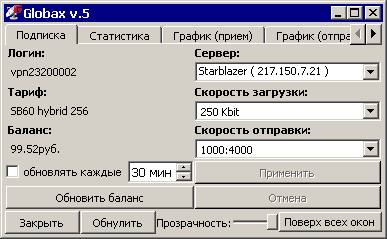 Работа через ускоритель Globax 5 в сети StarBlazer возможна только при наличии средств на лицевом счету и только после включения Globax 5 в Личном кабинете абонента.