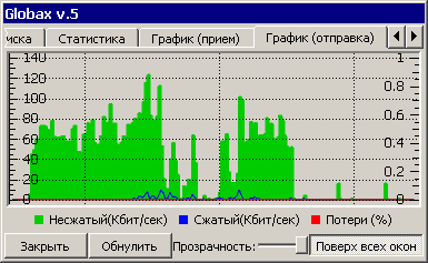 Закладки График (прием) и График (отправка) показывают статистику по приему (спутниковый канал) и отправке (наземный канал) в графическом виде. Отображается скорость приема и передачи данных (левая шкала, в кбит/с), а также процент ошибок (правая шкала, в процентах). Статистика отсчитывается от момента запуска Globax 5 или от нажатия кнопки Обнулить.