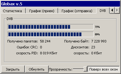 Закладка DVB показывается только в случае, если используется получение данных с DVB-карты в Globax 5. Отображаются "Уровень" и "Качество" принимаемого спутникового сигнала, информация о полученных данных и ошибках приема, общей скорости принимаемого спутникового потока и текущей скорости приема данных.