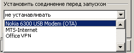 Установить соединение перед запуском — если вы используете коммутируемое подключение к "наземному" провайдеру (сотовая сеть, телефонное соединение, VPN и т.п.), то Globax 5 может автоматически устанавливать это соединение при подключении. Выберите требуемое соединение из выпадающего списка: